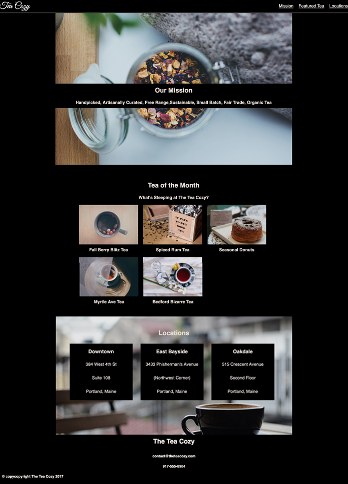 Tea Cozy is a small trial web page. Trying a few techniques that I had learned while learnig code. Such as adding text inside an image, making a footer and adding hierarchy in between images, and centering. Sorry, webpage isn't responsive to smaller screens. Click here to see live webpage. Click back button when done :) .