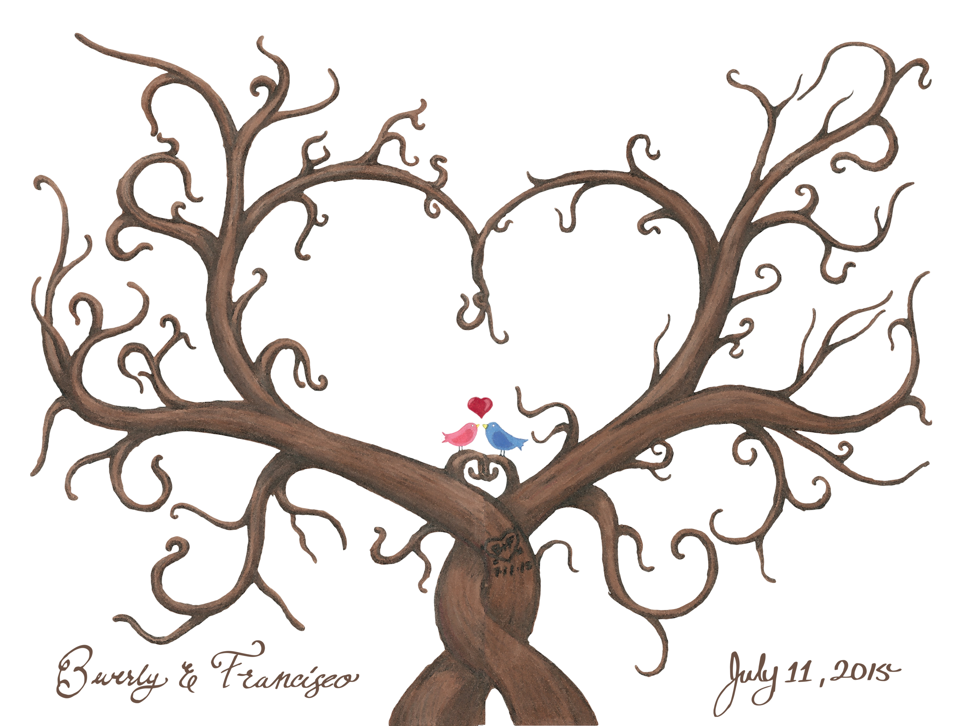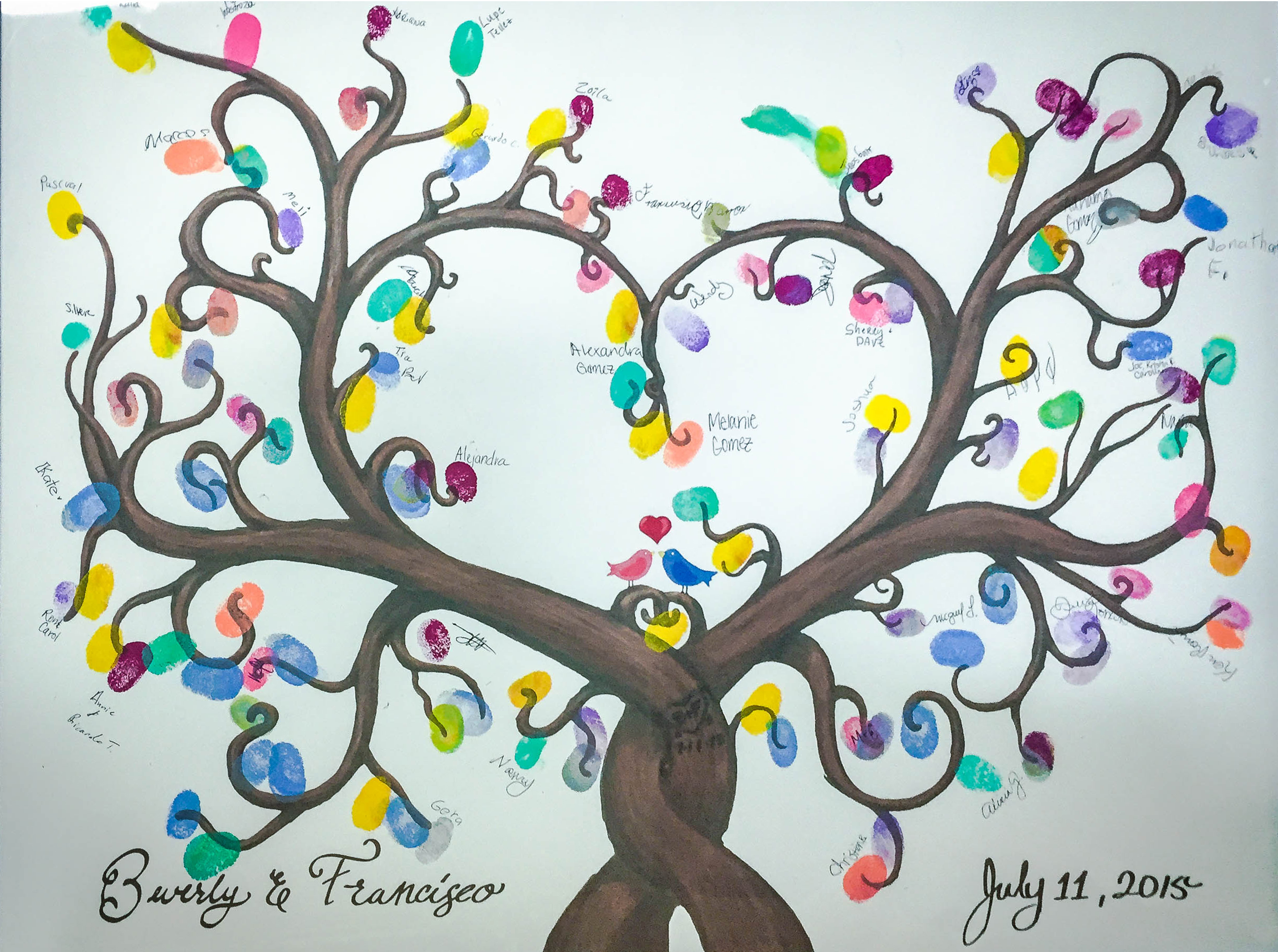 Instead of having a signature book at the reception of Beverly's and Francisco's wedding. I have created two trees, symbolizing love. Having two family trees becoming one. The guest are the leaves to these trees. Stamping their thumbs with various colors, to give them life and happiness. Beverly has displayed this art work in her livingroom, reminding them the best day of their life.